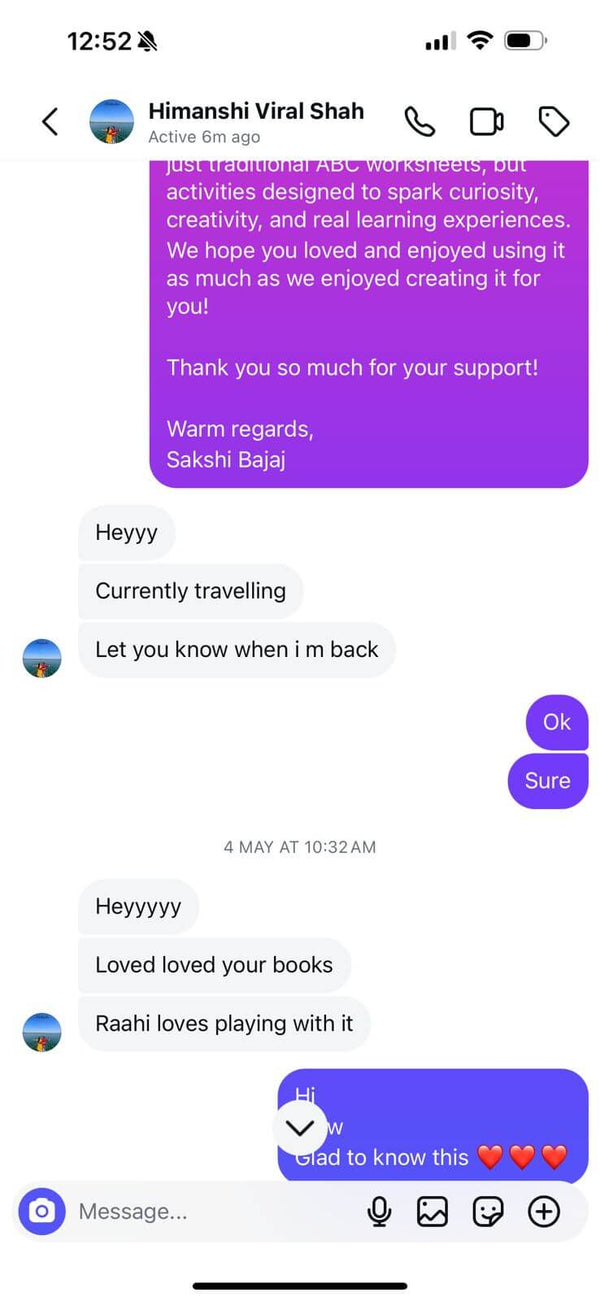 “All of your products are truly engaging! Rahi loved both Let’s Read with Your Baby and the 20-in-1 Binder. They’re not like the traditional ABC books — they are fresh, interactive, and exactly what every mother would love to give her child. Looking forward to your next launch soon !”