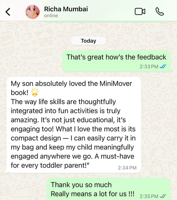 “We got the MiniMover Book in a deal, and it’s truly interesting and engaging. It’s helping my child go screen-free in the most enjoyable way. Along with it, we also received the e-book on screen-free methods — that is amazing too, very easy to understand, and it gives Indian parents clear insights on what to show, what not to show, and how much to show to a child. A complete package for mindful parenting!”